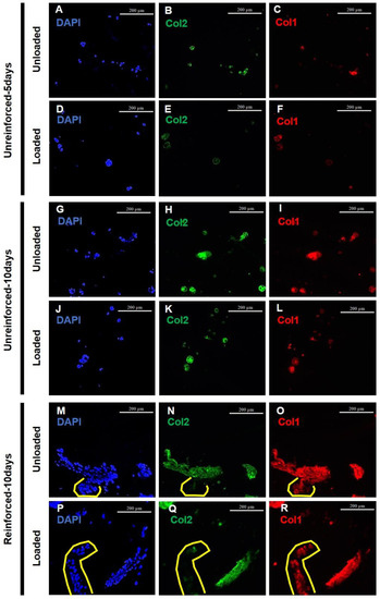 The deposition of Col1 and Col2 by the impregnated cells was visualized through immunofluorescence staining of sections in different groups (Figure 4). Most of the ATDC5 cells showing Col2 deposition also stained positively for Col1, indicating they were predominantly differentiated to fibrochondrocytes (Figure 4). According to the DAPI images, both loaded and unloaded reinforced-10 days groups showed high cell numbers (Figure 4). Sections from the loaded and unloaded reinforced-10 days groups also showed more aggregated cells (Figure 4). The depositions of Col1 in unreinforced-5 days and -10 days groups were associated with the deposition of Col2 (Figure 4), whereas in reinforced groups, some cells deposited Col1 without depositing any Col2 (Figure 4M–R, indicated by yellow lines). Col1 deposition also appeared to be stronger in unloaded and loaded reinforced-10 days groups (Figure 4) than in unloaded and loaded unreinforced-5 days and -10 days groups.