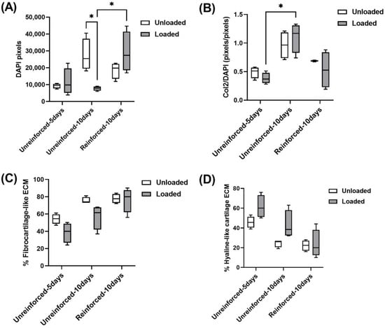 (A) Quantitative results showed that lengthening the culture period seemed to increase Col2 deposition in unreinforced constructs, and reinforced constructs trended to produce lower Col2 than the unreinforced constructs. (B) Cell numbers decreased by loading condition in the 10 days unreinforced group, whereas they increased in the loaded reinforced group. (C) Fibrocartilage-like ECM production tended to increase by increasing the loading period and reinforcing the constructs. (D) Hyaline-like cartilage ECM production was highest in 5 days of unreinforced constructs and lowest in reinforced groups. (n = 4 for each group, and * p < 0.05).