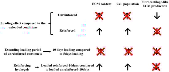 Summary of the main findings. Unreinforced constructs seemed to reduce fibrocartilage-like ECM production when they were loaded but did not seem to increase cell numbers or ECM contents. Conversely, the reinforced constructs seemed to be beneficial for mechanically loaded conditions, including in vivo implantations, since they seemed to increase cell numbers and ECM content, but fibrocartilage-like ECM production is high. Upward arrows represent an increase in cell numbers and ECM content, while upward arrows with ‘×’ indicate no change or reduction. The downward arrow signifies a desired decrease in fibrocartilage-like ECM production, and downward arrows with ‘×’ represent no change or reduction.