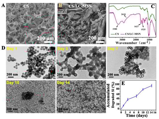 (A,B) SEM images of lyophilized CS or CS/LC−MSN specimens. (C) FTIR spectra of CS or CS/LC−MSN scaffolds. (D,E) In vitro evaluation of biodegradation and degradation behavior of CS/LC−MSN composite hydrogel incubated with SBF solution for 1, 3, 7, 10, or 14 days.