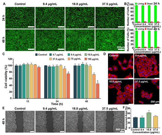 Effect of LC−MSN on the cell behavior of HUVECs. (A) Live/dead assays of HUVECs co−incubated with complete culture medium or LC−MSN and (B) its quantitative analysis of live/dead cells. (C) CCK−8 assays of the proliferation of HUVECs after culturing for 12, 24, and 48 h (* p < 0.05). (D) CLSM images of stained HUVECs showing morphology cultured in concentrations of LC−MSN for 48 h. (E,F) Migration assays of HUVECs cultured in the four groups (* p < 0.05).