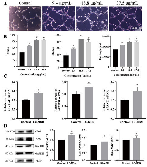Angiogenesis assay of HUVECs in vitro. (A) Tube formation (CTF) assays of different concentrations of LC−MSN and (B) the corresponding quantitative analysis (* p < 0.05). (C) The expression levels of VEGF, CD31, and ANG are based on the qPCR technique (* p < 0.05). (D) Western blot analysis and the corresponding quantification of VEGF, CD31, or ANG expression in HUVEC cells incubated with various formulations (* p < 0.05).