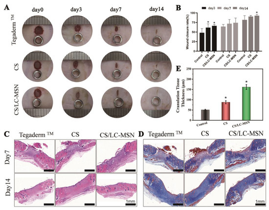 Morphologies and histological assessments of wounds. (A) Digital photos of skin wounds that were treated with various treatments within 14 days. (B) Wound closure rates during the 14−day post−surgery period (* p < 0.05). (C,D) Histological analysis of wound defects treated with Tegaderm™, CS, and CS/LC−MSN hydrogels using H&E staining and Masson staining at 7 and 14 days. (E) Corresponding quantitative analysis of the granulation tissue thicknesses at 14 days (* p < 0.05).