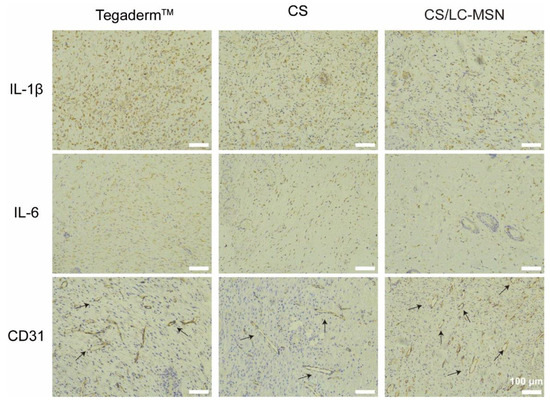 Images of immunohistochemical staining for IL−1β or IL−6 and CD31 of the full−thickness wounds after 7−day implantation of Tegaderm™, CS, and CS/LC−MSN hydrogels.