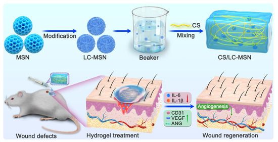 The fabrication of CS/LC−MSN composite scaffolds by simply mixing of CS with LC−MSN. The CS/LC−MSN gel could be facilely administrated via injection to treat wound defects.