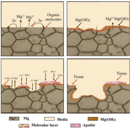 The biodegradation of Mg implants occurs in several stages, including surface oxidation, corrosion, and dissolution [47,48].