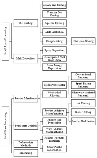 A variety of methods can be employed for the shaping of Mg-based temporary implants, and they can be broadly grouped under either liquid or solid-state processing methods as shown in Figure 5. Liquid-state processes involve metal casting and shaping methods, such as melt infiltration, stir casting, and melt deposition. Similarly, the solid-state processing involves powder metallurgy, solid-state joining, plastic deformation, and machining methods. Each of these methods are discussed briefly in the following section.