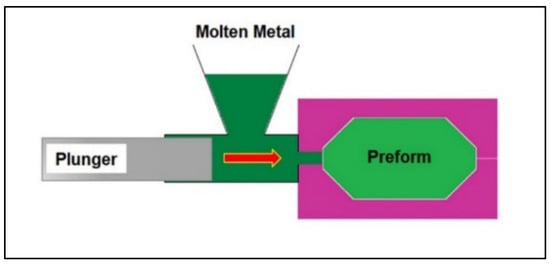 This process involves the injection of molten Mg into a die or mold cavity to generate the required shape. It is typically carried out in three steps: (i) preparation of die, during which the die or mold cavity is coated with a lubricant to prevent molten Mg from sticking to its surface; (ii) melting, followed by the injection of molten Mg; and (iii) ejection of Mg casting upon solidification (Figure 6).