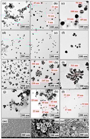 The obtained results reveal different morphologies depending on the plant extract concentration in the presence and absence of Cu2+ ions. The nanostructures obtained at a low concentration of 10% of the precursor with Cu2+ ions in the reaction system are spherical with a size of about 100 ± 30 nm, as shown in Figure 1a–c. Increasing the plant extract concentration to 20% in the presence of Cu2+ ions results in a transition state that slightly changes the spherical shape to an unstable and undefine structure, as shown in Figure 1d–f. Afterward, the plant extract concentration was increased to 30% to investigate the possibility of changing the shape of the nanostructure. It is found that the shape of dendrites is clearly formed as the concentration of the plant extract increases (Figure 1g–i). The nanodendrites have an average size of ~300 ± 30 nm. Figure 1j shows the results obtained in the absence of copper nitrate hydrate when using a low concentration of 10% of precursor. The obtained nanoparticles are spherical at this concentration, and no dendritic morphology was observed even when the concentration was increased to 30% of the precursor (as shown in Figure 1k,l). Therefore, for the formulation of nanodendrites, the volumetric concentration of plant extract should be as high as 30% in the presence of Cu2+ ions. Additionally, Figure 1m shows the SEM observation results for AgNPs, and Figure 1n,o displays AgNDs.