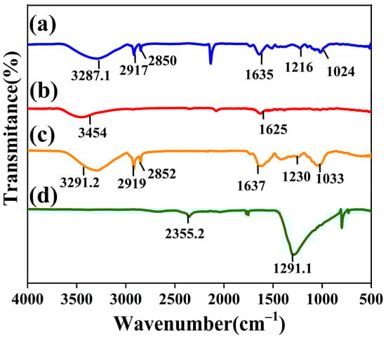FTIR investigations were employed to determine whether bioactive compounds are found on the surface of nanoparticles. Figure 3a demonstrates that AgNDs exhibit a peak at 3287 cm−1 related to O–H stretching vibrations of hydroxyl groups present mainly in plant phenols and alcohols. Two peaks are observed at 2917 cm−1 and 2850 cm−1, which are associated with C–H stretching vibrations. The peak observed at 1635 cm−1 can be attributed to C=C stretching (in aromatic rings present in terpenoids) and C=O ketones (in flavonoids). C-N bending vibrations appear at 1216 cm−1 and 1024 cm−1 related to the amide group of plant extract [45]. Figure 3b illustrates the FTIR spectrum of AgNPs. The broader spectrum detected at 3454 cm−1 can be ascribed to the O–H stretching. The peak seen at 1625 cm−1 is due to C=C and/or C=O stretching vibrations. Figure 3c displays the functional groups of Moringa oleifera extract leaf powder. The peak at 3291.2 cm−1 can be represented by the O–H stretching vibration, and the other peaks (2919 cm−1 and 2858 cm−1) can be confirmed by the C–H stretching of the alkane group. The peak at 1637 cm−1 can be assigned to C=C stretching and C=O. The peaks seen at 1230 cm−1 and 1033 cm−1 are associated with C–N bonds in the amine group [46]. From the FTIR results, it is predicted that the C=O group is dominantly involved in the reduction, while C–H and C–N stretching are likely involved in the shaping of the nanoparticles because they are not observed in the silver nanosphere vibration analysis. These results for Moringa oleifera are like previously reported results [47]. The presence of identical peaks with a slight peak shift in nanoparticles and Moringa oleifera powder suggests that the synthesized nanoparticles are capped with bioactive functional groups present in this plant. Silver nitrate shows an intense peak at 1291.1 cm−1 [48], indicating an Ag+NO3− ion pair, as shown in Figure 3d.