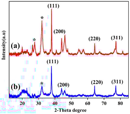 XRD analysis of (a) silver nanodendrites and (b) silver nanospheres. Extra peaks with (*) sign indicate the presence of organic compounds from Moringa oleifera.