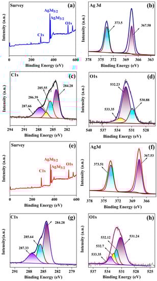 The synthesized silver nanostructures are further analyzed using XPS, as manifested in Figure 5. Figure 5a,e shows the survey spectra for AgNDs and AgNPs, confirming the presence of Ag0 as a major constituent. Ag peaks are detected at 365–376 eV (Figure 5b,f). As a spin-orbital splitting, the Ag3d peak is shown as a doublet with two states: 367.5 eV Ag3d5/2 and 373.5 eV Ag3d3/2 with splitting energy of 6 eV, confirming the state in Ag0 [52,53]. Figure 5c describes the deconvolution of C1s spectra from AgNDs with four signals at 284.28, 285.5, 286.39, and 287.66 eV with respect to the C=C, C–O, C–N, and C=O relationships [54,55,56]. The O1s XPS spectrum exhibits three signals at 530.88, 532.23, and 533.35 eV (Figure 5d) due to AgO, O–H, and C–O, respectively [57,58]. For AgNPs, the pattern gives a C1s spectrum (Figure 5g) with deconvolution into three peaks at 284.2, 285.6, and 287.3 eV, indicating the presence of C=C, C–O, and C–C connections [59,60,61]. The O1s XPS (Figure 5h) represents four peaks at 531.24, 532.12, 532.7, and 533.35 eV corresponding to the O–H, C=O, C–O linkages [62,63]. These results confirm the successful synthesis of silver nanostructures with Moringa oleifera leaf extract. Results are in accordance with FTIR studies confirming the connection.
