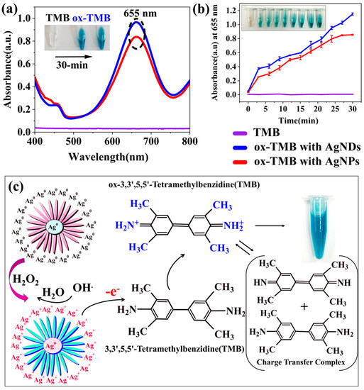 Several nanoparticles are known to exhibit peroxidase activity, including cobalt tertraoxide [64], copper [65], nickel [66], gold [67], and silver nanoparticles [68]. In this study, the peroxidase activity of silver nanostructures was investigated using a chromogenic reagent TMB as shown in Figure 6. Originally, TMB did not exhibit any peak and appeared colorless, but when oxidation begins, with the release of Ag+ ions, colorless TMB undergoes oxidation and turns into a blue-colored diimine. The phenomena can be observed visually, and spectrometry analysis confirms the reaction as a band at 655 nm (Figure 6a). The absorbance of the samples was monitored over time, and comparisons were recorded specifically at 655 nm every 30 min with a spectral range of 400 to 800 nm, which gradually increases with rising TMB-oxide, as shown in Figure 6b. In contrast to AgNPs with a maximum OD of 0.8, AgNDs displayed higher oxidation, i.e., a maximum OD of 1.1. The plausible mechanism that could take place during this reaction and result in peroxidase activity is shown in Figure 6c. The process involves the following main steps: catalytic decomposition of H2O2 upon the addition of nanoparticles, and TMB oxidation via Ag+ ions, which is confirmed by a color change from colorless to blue. Initially, with H2O2, Ag0 undergoes Ag+ ion formation, which leads to the decomposition of H2O2 into OH radicals [69]. The free radicals then oxidize the peroxide substrate TMB, which confirms the formation of silver cation (Ag+) on the surface of silver nanostructures. In addition, the oxidized form of TMB can exist in equilibrium with the charge transfer complex and the diimine derivative for TMB.