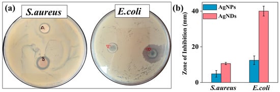 Antibacterial activity of nanostructures against Gram-positive and Gram-negative bacteria. (a) Antimicrobial activity of silver nanospheres (A) and silver nanodendrites (B) against S. aureus and E. coli. (b) Zone of inhibition (mm) of silver nanospheres (AgNPs) and silver nanodendrites (AgNDs) against representative bacteria. Error bars represent the standard deviation of triplicate experiments.