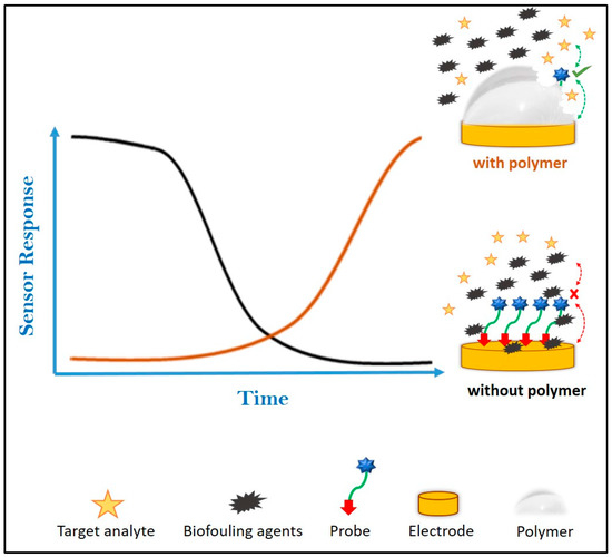 There has been widespread interest in the development of electrochemical sensors and biosensors for the selective detection of different analytes, both in vitro and in vivo. This includes their integration into wearable [1,2] or implantable [3,4] platforms, due to their high sensitivities, low detection limits, modifiable electrode architectures, and ready integration, with control and analysis instrumentation along with minimal sample requirements. However, when an implanted device needs to be used for long periods of time, biofouling often causes the sensor transducer (functionalised electrode) surface to become passivated by fibrous capsules and non-specific proteins [5]. This foreign-body response remains a major issue to be addressed for implantable electrochemical sensing devices as it significantly limits their lifetime and compromises their response [6]. Indeed, if implanted biomaterials/devices are not suitably designed or protected, potential risks related to the foreign body response include capsule formation, prolonged inflammation, haemorrhage, tissue oedema, fibrosis, synovitis, thrombosis, restenosis and organ failure [7]. Accordingly, there is growing interest in avoiding or blocking biofouling through minimising the size of the sensor, reducing material-tissue interactions and/or protecting these implantable sensing systems from tissue exposure. This includes a variety of approaches based on polymers, including hydrogels, SAMs, MEMS and even fluidic systems [8,9,10].