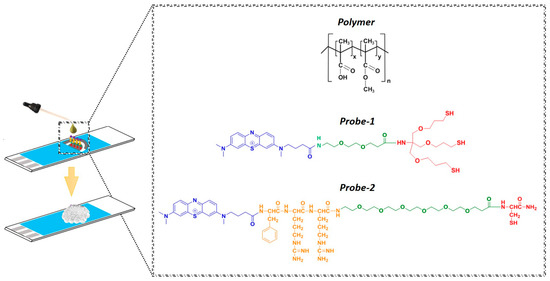 Figure 2. The preparation of the sensing electrode. Chemical structure of Eudragit® (top): The ratio of methacrylic acid and methyl methacrylate units was approximately 1:2 for Eudragit® S100 (n is the degree of polymerisation). The chemical structures of the probes used for pH (Probe-1) and trypsin (Probe-2) sensing: Probe-1 contains methylene blue (blue) as the redox tag, PEG-2 as a spacer and a tripodal anchor (red), whereas Probe-2 contains methylene blue (blue) as the redox tag, attached to the trypsin-cleavable peptide sequence Phenylalanine-Arginine-Arginine (orange) and PEG-6 (green) as the spacer and Cysteine (red) as the anchor.
