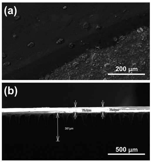 Figure 3. (a) Top-view and (b) cross-sectional SEM images of the polymeric film coating.