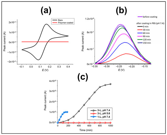 Figure 4b then shows typical SWV curves registered for an Au-SPE which had been modified with the pH-sensing probe (Probe-1) ([29], drop-casting overnight) compared to that obtained after coating with a single layer of 16% Eudragit® S100. It is clear that the SWV peak current (purple curve) of ~1.1 µA before the polymer layer was drop-cast, decreased to zero after the polymer was coated on top of the probe-1-modified electrode surface, again confirming that the polymer layer completely covered the SAM-modified surface and completely blocked the redox reaction of the underlying surface-bound redox tags. This was attributed to the effects of this resistive polymer layer in blocking electron transfer by preventing solvation, and ion/proton transport to the methylene blue (MB) from the solution. As expected, at pH 7.4, the characteristic redox peak for MB was observed and this signal increased with time due to progressive dissolution of the polymer layer. The signal essentially returned to the initial, uncoated value within 150 min, indicating ~95–100% dissolution. It was also observed that the dissolution rate was faster initially and then levelled-off over time. It is interesting that there was a progressive shift of ~−30 mV in the SWV peak potentials between the partially (after 30 min dissolution) and fully uncoated probe-modified electrode, albeit with a similar peak width consistent with a clear difference in the average redox environment, most likely due to attributed to the local ion activity and/or solvation environment for the SAM-based probes.