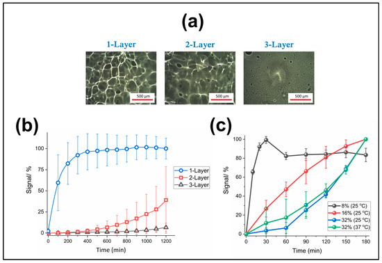 Figure 5. Sensor optimisation: (a) Optical microscope images of the Au-SPEs drop-cast with 1, 2, or 3 consecutive layers of 16% (w/v) of Eudragit® S100 in isopropanol. (b) The relationship between % signal change and polymer dissolution time and layer thickness, as measured by the redox signal for Probe-1 attached to the Au-SPEs and coated with different numbers of polymer layers (1, 2 or 3-L) upon immersion in PBS (pH 7.4) over 1200 min and interrogated by SWV. (c) The relationship between the % normalised change in the redox signal registered for Probe-1 modified Au-SPEs drop-cast with a single layer of Eudragit® (from solutions with varying concentrations of 8%, 16% or 32% w/v) during immersion in PBS at the specified temperature over 3 h and interrogation with SWV. In all cases the averages and error bars are for three replicates.