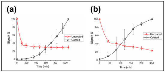 Figure 6. Anti-biofouling performance of the sensor: (a) % Signal changes measured for the sensor coated with three consecutive layers of 16% Eudragit® and the uncoated sensor (Au-SPEs modified with Probe-1) in DMEM with 10% FBS (pH ~7.2). (b) % Signal changes measured for the sensor coated with a single layer of 16% Eudragit® and the uncoated sensor (Au-SPEs modified with Probe-2) in DMEM with 10% FBS. The averages and error bars are for three replicates.