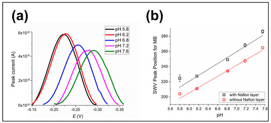 It was important to show that the protected and activated sensors had similar performance before and after polymer dissolution. Therefore, an experiment was performed to check the pH sensitivity of the exposed sensors, using the same method as previously reported [29]. As shown in Figure 7a, Nafion-coated and uncoated pH sensors (following the complete dissolution of the top Eudragit® S100 layer) were placed in phosphate buffers with varying pHs (5.8, 6.2, 6.8, 7.2 and 7.6) and interrogated by SWV. Afterwards, the peak potential of the MB redox signal was plotted against pH to create a calibration line for their pH response (Figure 7b). This resulted in pH sensitivities of 36 ± 2 mV/pH unit for Nafion-uncoated and 39 ± 4 mV/pH unit for Nafion-coated sensors. Considering the same Nafion coating protocol (drop-casting 3 μL water-diluted Nafion solution at 1:3 ratio) used as in previous work [29], it was interesting that here Nafion did not show any significant difference in potential-pH sensitivity, rather a difference in potential offset, and the slope observed was midway between 2e/2H+ and 2e/1H+ behaviour, which could be an indication of the possible interaction between Nafion and the Eudragit® S100 polymers altering the redox behaviour of the MB.