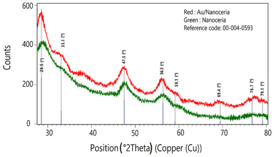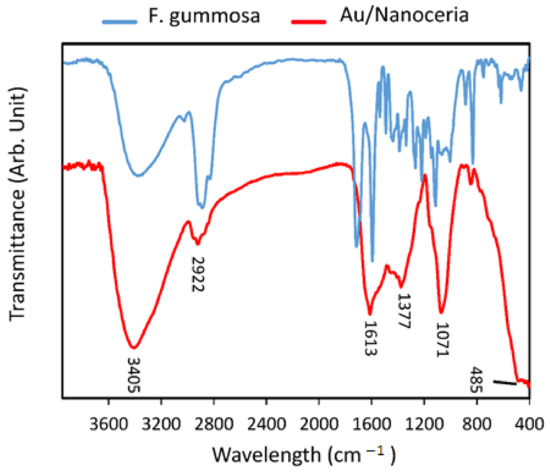 The peaks in the plant extract clarified the presence of different functional groups in the plant extract that could interact with the cerium ions. The adsorption peaks at 3400 cm−1 were associated with the O-H signal (Figure 2, red). The band 2922 at cm−1 was related to C-H stretching. The vibrations of the aromatic C=C bond were observed at 1613 cm−1. Moreover, the peaks at approximately 1377 cm−1 and 1071 cm−1 represented C-H bending and C-O stretching of primary alcohols, respectively. The comparison between the FTIR spectrum of F. gummosa and Au/nanoceria revealed the presence of F. gummosa in the NPs. The 485 cm−1 adsorption band was also related to the Ce-O vibration and the formation of nanoceria [45].