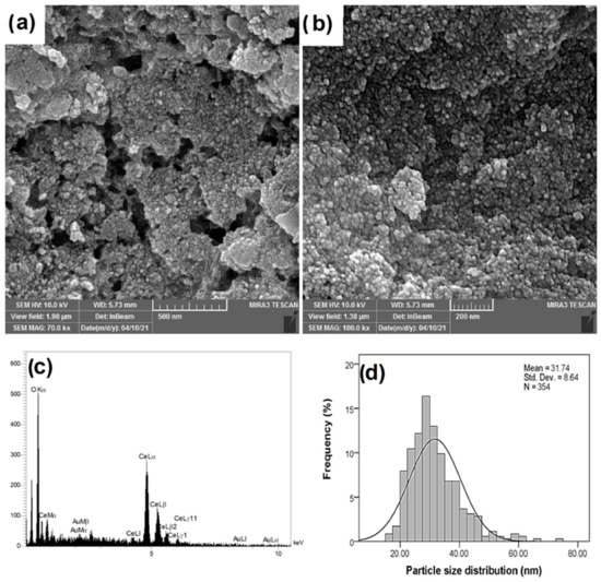 FESEM images (a,b), EDX analysis (c), and particle size distribution (d) of Au/nanoceria.