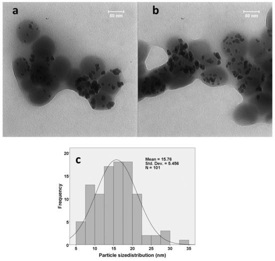 The TEM images also demonstrated spherical and semi-spherical morphologies. The particle size distribution (PSD) was in the range of 5–35 nm, with a mean diameter of 15.76 ± 5.46 nm. The particles were enveloped with spheres that could be composed of organic residues from F. gummosa (Figure 4).
