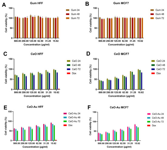 Cellular toxicity effect of biosynthesized Au/nanoceria against HFF cells as a normal cell line, and MCF7 breast cancer cell lines in different doses at 24, 48, and 72 h. (A,B) Cytotoxicity effects of gum against the HFF and MCF7 cell lines. (C,D) Cytotoxicity effects of CeO NPs and doxorubicin (Dox) against the HFF and MCF7 cell lines. (E,F) Cytotoxicity effects of CeO-Au NPs and Dox against the HFF and MCF7 cell lines. Data are represented as the mean ± SD. The test was done in triplicate.