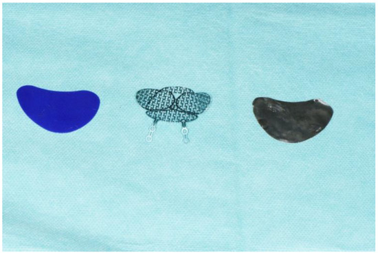 The composition of PDO foils used in this study was 100% polydioxanone (PDO). The PDO foils were thin and flexible biodegradable sheets. PDO foils can take several months to degrade completely. During surgery, the PDO foil was cut to the appropriate size and shape and placed over the damaged area of the orbital floor. The foil was then secured in place without using sutures or other surgical fixation methods. The PDO sheet (Ethicon, Germany) had a size of 40 mm × 30 mm and a nominal thickness of 0.25 mm. All implants are displayed in Figure 1.