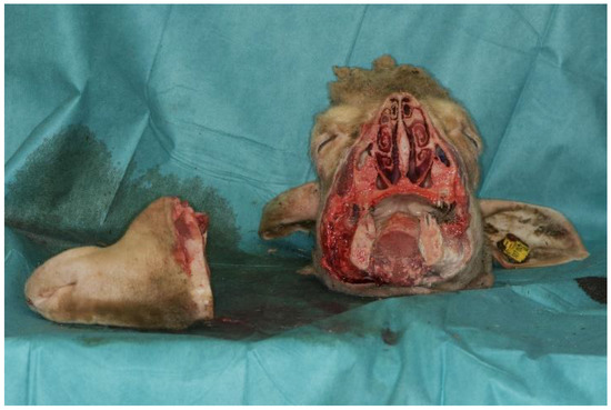To fit in the CBCT, the snouts of the animals were sawed off (Figure 3), but orbits were left intact. After completion of the study, all animal tissues were disposed as biomedical waste.