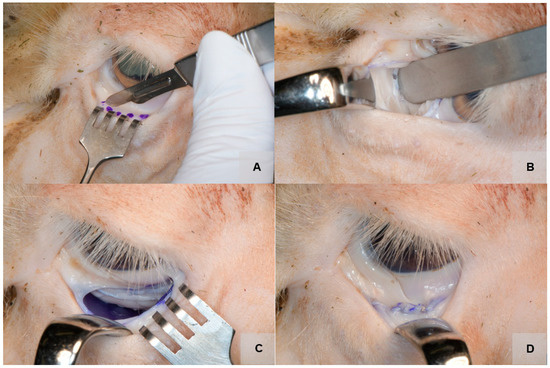 Orbital view: incision using a scalpel in the area of the marking (A); exposure of the orbital floor (B); insertion of the PDO sheet (C); wound closure with a resorbable suture (D).