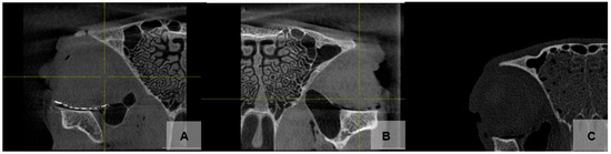 Two examiners assessed the position of the orbital implant using the CBCT scans and a rating scale of 0–10 [21]. All scans were performed using Planmeca ProMax 3D Max (Planmeca, Finland). The field of view was 15.0 × 6.9 cm, covering both orbits, with a 200 μm voxel size. An initial data set screening was performed on an MDNC-2221 monitor (resolution: 1600 × 1200; size: 432 × 324 mm; 59.9 Hz; Germany) using the Planmeca Romexis software (Planmeca, Finland). An evaluation of the reconstructed orbital floor by CBCT showed good positioning of all three tested implants (Figure 5). All of the materials were detectable in the CBCT scans. Visibility was significantly higher (p < 0.001) for titanium mesh than for PDO or ZX00 magnesium orbital floor plates. The animal bones were easily visible and distinguishable from surrounding soft tissues, as they had a similar Hounsfield value range as human bones, ranging from 700 to 3000 HU.