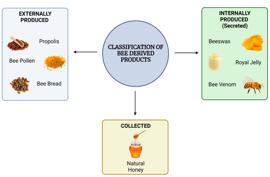 Humanity is entirely reliant on natural resources for survival. Nature provides the energy that sustains our cells, the nutrients that build up human bodies, and the ecosystem comprising biodiversity from which our day-to-day necessities are derived. According to specialists at the United Nations Food and Agriculture Organization (FAO), bees are responsible for one-third of the world’s food output. Bees are ideally designed to pollinate, aiding plants in growing, reproducing, and producing food by transporting pollen between flowering plants and keeping the life cycle going. Additionally, they produce high-quality food, such as honey, but also functional food and superfoods, such as royal jelly, propolis, bee pollen, bee bread, and other materials, such as beeswax and bee venom, all of which have different nutraceutical and medical applications within our current lifestyle. Honeybee products can typically be classified into two distinct types based on how they are collected: produced externally or produced internally and then secreted, as shown in Figure 1.