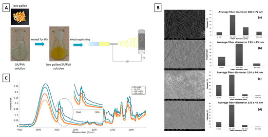 Illustration of bee pollen incorporated SA/PVA electrospun nanofibrous mats. (A) Schematic of the preparation of bee pollen-loaded SA/PVA electrospun nanofibrous mats by electrospinning. (B) SEM images and fiber diameter distributions of the electrospun SA/PVA fibers obtained by blending different fractions of 1%, 2%, and 3% of bee pollen in an electrospinning solution. (C) ATR-FTIR spectra of the bee pollen, the electrospun SA/PVA, and bee pollen-loaded SA/PVA nanofibers. Reproduced with permission from [102], Creative Commons Attribution (CC BY), 2021.