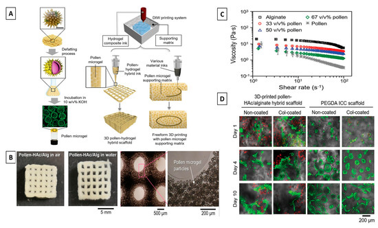 Pollen-derived microgel suspension for bioink development. (A) Schematic depiction of pollen microgel as a bioink and supporting matrix material for 3D bioprinting applications. (B) Optical images of hyaluronic acid/alginate scaffolds. (C) Shear thinning behavior of pollen-polymer blends prepared using different volume ratios of polymer-to-pollen. (D) Live/dead staining of Huh-7.5 cells cultured on 3D-printed pollen–hyaluronic acid/alginate hybrid scaffold (noncoated, Collagen-coated) compared with PEGDA ICCs (noncoated, Collagen-coated) on days 1, 4, and 10. Live cells were stained with calcein-AM, fluorescein green, whereas dead cells were stained with EthD-1, fluorescein red. Reproduced with permission from [109], John Wiley and Sons, 2021.