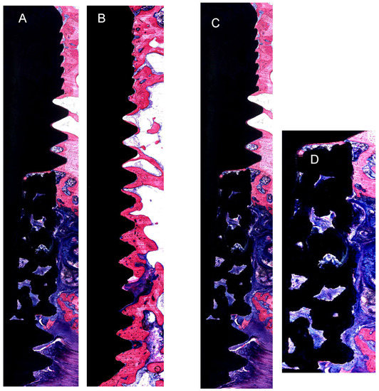 - Fabbro, M.D.; Taschieri, S.; Canciani, E.; Addis, A.; Musto, F.; Weinstein, R.; Dellavia, C. Osseointegration of titanium implants with different rough surfaces: A histologic and histomorphometric study in an adult minipig model. Implant. Dent. 2017, 26, 357–366. [Google Scholar] [CrossRef] [PubMed]