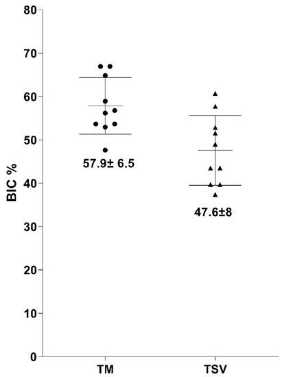 This figure presents a graphical depiction of the Bone-to-Implant Contact (BIC) percentage for both the Trabecular Metal Implant and the Screw Vent Implant (TSV).