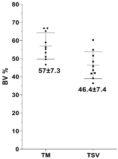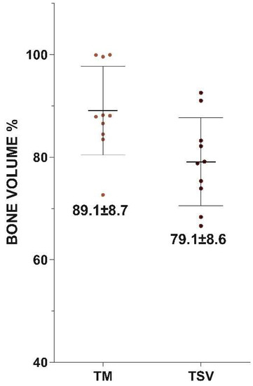 Micro-CT Assessment: The findings from the bone volume (BV) evaluations conducted using micro-CT are illustrated in Figure 6. The average bone volume for TM implants was recorded as 89.1 ± 8.7, compared to 79.1 ± 8.6 for TSV implants. The percentage of bone volume surrounding the Trabecular Metal implant was markedly higher than that surrounding the TSV implants, as depicted in Figure 7.
