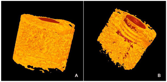 Following fixation in formaldehyde and dehydration in 70% ethanol, the bone samples underwent three-dimensional micro-computed tomography (micro-CT) to determine the bone mineral density and volume around the implant. During scanning, the specimens were wrapped in Parafilm M® (Pechiney Plastic Packaging, Chicago, IL, USA) to prevent drying. The samples were then scanned at an energy level of 101 kV and intensity of 96 μA with a resolution of 37.41 μm per pixel, using an aluminum filter (1 mm) (Skyscan-1072 X-ray Microtomograph, TomoNT version 3N.5, Skyscan®, Kontich, Belgium). Bone mineral density calibration rods were also scanned as a reference. Cone-Beam reconstruction was performed using Skyscan® software (version 2.15, Bruker MicroCT, Kontich, Belgium). All scan and reconstruction parameters were standardized for the specimens and calibration rods [25].