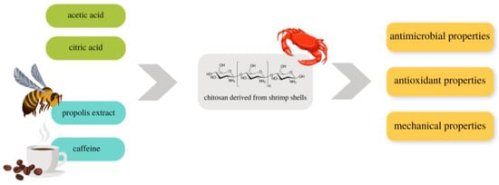 The aim of this research was to obtain films based on shrimp-derived chitosan with the addition of the biologically active substances: ethanolic propolis extract (EEP) and caffeine. Two acids—acetic and citric—were used to prepare the film-forming solutions. The obtained films were characterized in terms of their mechanical, structural, and antimicrobial properties to assess their potential in biomedical applications as biodegradable wound dressings. The scheme of the research is presented in Figure 1.