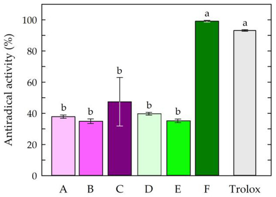 Antiradical activities of the chitosan film-forming solutions. Symbols of chitosan-based solutions (A–F) according to Table 1. The different letters above the bars in the graph indicate statistically significant differences at p < 0.05.