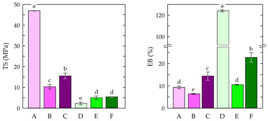 Tensile strength (TS) and elongation at break (EB) measurements of the chitosan film samples. Symbols of chitosan-based films (A–F) according to Table 1. The different letters above the bars in the graph indicate statistically significant differences at p < 0.05.