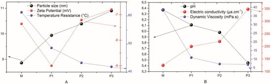 | Samples | Particle Size (nm) | Zeta Potential (mV) | Temperature Resistance (°C) |