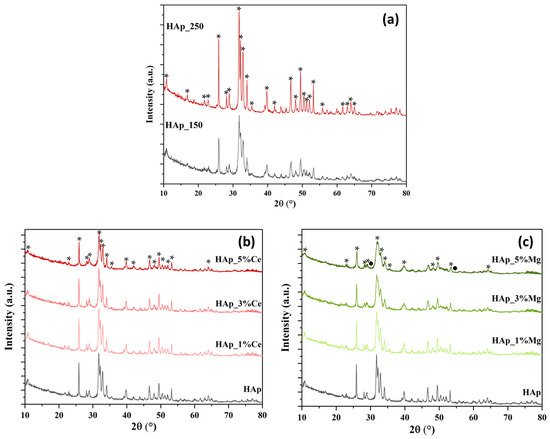 X-ray diffractogram for hydroxyapatite powders synthesized at different parameters of microwave-assisted hydrothermal treatment (a) and hydroxyapatite powders substituted with cerium (b) and magnesium (c) ions at concentrations of 1, 3, and 5% (*—HAp, ●—Whitlockite).