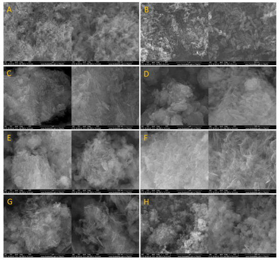 SEM micrographs recorded for HAp_150 (A), HAp_250 (B), HAp_Ce_1% (C), HAp_Ce_3% (D), HAp_Ce_5% (E), HAp_Mg_1% (F), HAp_Mg_3% (G), HAp_Mg_5% (H).