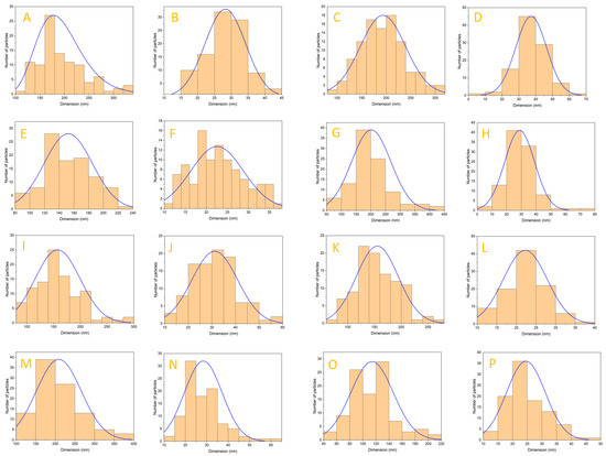 Dimensional distribution for HAp_150, HAp_250, HAp_Ce_1%, HAp_Ce_3%, HAp_Ce_5%, HAp_Mg_1%, HAp_Mg_3%, HAp_Mg_5% by length (A,C,E,G,I,K,M,O) and by diameter (B,D,F,H,J,L,N,P).