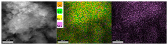 Analyzing the hydroxyapatite powder with the highest proportion of cerium, the presence of the substituent element is observed, uniformly distributed alongside the element’s characteristic of hydroxyapatite (Figure 6).
