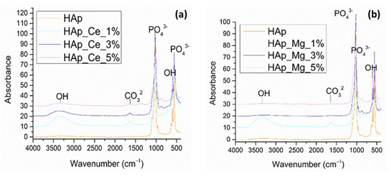 FT-IR spectra recorded for HAp_150, HAp_Ce_1%, HAp_Ce_3%, HAp_Ce_5% (a) and Hap_150, HAp_Mg_1%, HAp_Mg_3%, HAp_Mg_5% (b).