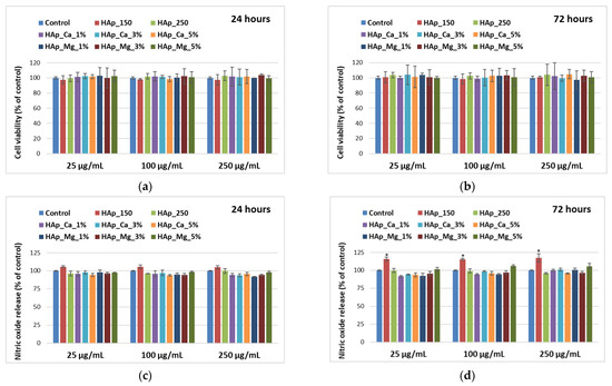Viability level (a,b) and nitric oxide release (c,d) of MC3T3-E1 osteoblasts cultured in the presence of different concentrations (25, 100, and 250 µg/mL) of HAp samples for 24 h and 72 h. Results are calculated as means ± SD (n = 3) and represented relative to control (cells that were not incubated with HAp samples); the statistical analysis: two-tailed Student’s test * p ≤ 0.05 were considered as statistically significant.